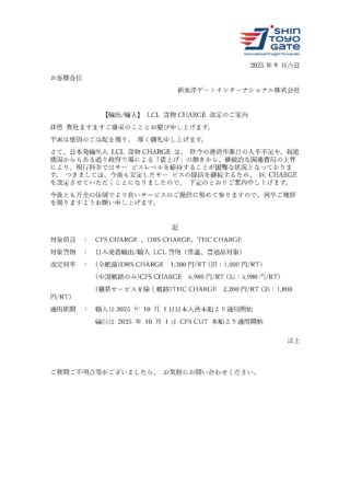 再掲 2025年9月掲示 【輸出輸入】 LCL 貨物CHARGE 改定のご案内